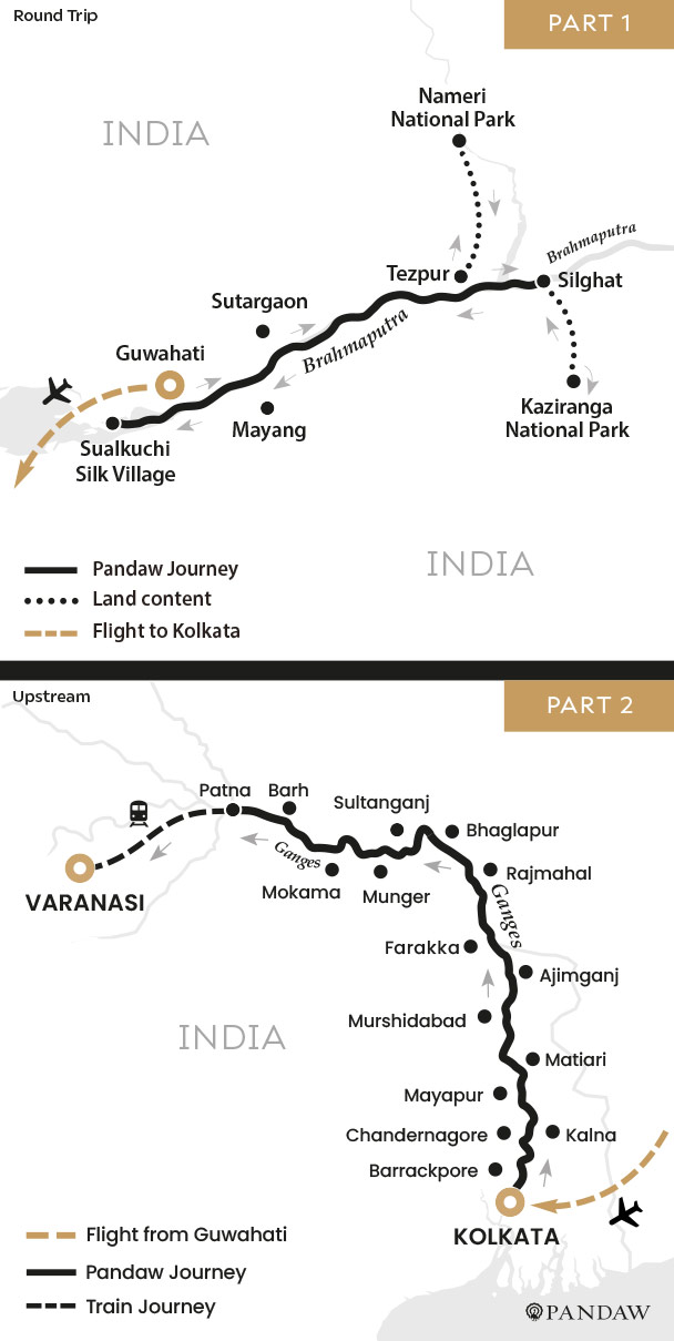 Join us for a grand tour of India sailing 21 nights along the glorious Ganges & mighty Brahmaputra rivers. Inclusive of flights and transfers between Kolkata and Guwahati, Pandaw's newest combo cruise invites you to experience the best of India's waterways aboard our timeless colonial vessels. Add on one of our pre and post-cruise packages to Dehli & the golden triangle for a truly 'All India' experience.